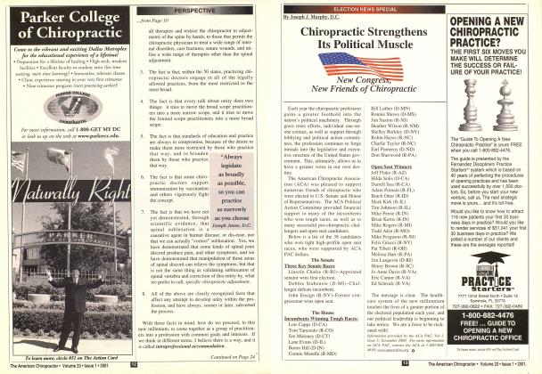 Northwestern Northwestern University's Minnesota Institute of Acupuncture and Herbal Studies, (MIAHSl. graduated seven at their 9ln commencement in December. 2000. MIAHS, founded in 1990, has the only accredited master's degree program in acupuncture and oriental medicine in Minnesota. A recent study conducted by associate professor. David Stude. DC, shows that Orthopedic shoes can improve club-head velocity for experienced golfers. Los Angeles College of Chiropractic- Southern California University of Health Science's (SCU) Los Angeles College of Chiropractic in Whittier, CA, has recently received its seven year renewal of accreditation from the Council on Chiropractic Education. (CCE). "When you combine this with the institution's 10-year accreditation from the Western Association of Schools and Colleges. WASC), it shows our students and the community that we provide a high quality program." said LACC president. Reed B. Phillips, DC, PhD. Life University The 18th annual Run for Life will be held Saturday. August 1 I. 2001. It will feature a 5K. 10K. 1 mile run, and a Tot Trot. For further information, call 770-426-2786. The Georgia Sports Hall o Fame recently honored Life founder and president, Sid E. Williams. DC. with their 2001 Chairman's Award. Dr. Williams, a captain of the 1951 Georgia Tech Orange Bowl Championship football team, received the award at the GSHF Annual Banquet in February. New York Chiropractic College NYCC Alumni are invited to the Unity Day 2001 celebration on July 20, 2001. Their office of continuing ed. will feature 2 courses: "The Role of Chiropractic in the New Millennium", speaker Thomas Ventimiglia. DC. Toronto, Ontario March 29th, 2001: and "An Evening with Dr. Frank J. Nicchi. NYCC President". April 18. 19, 25, 26, 2001. Contact Diane Zinc. 800-234-6922 for more info. Palmer College of Chiropractic Guy F. Riekeman. current president of Palmer College in Davenport. IA. has been appointed president of Palmer College West in San Jose. CA. Chancellor Michael E. Crawford made the announcement recently in San Jose at PCCW. This unprecedented move will effectively make Riekeman president of both schools in the Palmer University System. The two colleges, PCC and PCCW, were brought together 10 years ago with the creation of the Palmer Chiro- practic University System. The single presidency for the entire Palmer Chiropractic educational program paves the way for the implementation of a common curriculum for the 2 present colleges and a third campus planned for Port Orange. FL. "I am humbled, honored, and excited by the possibilities afforded by this new appointment." Dr. Riekeman said. "More than ever....The Palmer Colleges....will continue to graduate the best chiropractors the world has to offer." Frank Sartz. DC. 1931 Palmer College graduate, upon his death in 1999. willed his entire estate to the school. The total lifetime gift, including $1 million already given for scholarships in 1995. was S4.2 million, making it the largest in the history of Palmer College. Dr. Rollund Lucas and his wife. Dr. Eileen Lucas, both 1941 graduates of Palmer, have willed their estate to the school. This gift of over $6()0.()0() will be used for scholarships to help more students affordably attend the Palmer University svstem. Life Chiropractic College West The Hayward Chamber of Commerce recently named Dr. Gerard W. Clum the Business Person of the Year at their annual gala. Dr. Clum was also honored by students and faculty to celebrate his 20 years of dedication to the college as its first and only president. National University of Health Sciences NUHS president. Dr. James F. Winterstcin was recently named Chiropractor of the Year by the Illinois Chiropractic Society. Robert G. Frieman. DC, has been elected president of the NUHS Alumni Association. National University is pleased to announce that construction is underway on a new computer lab. The facility, funded 100 percent by donation and the NUHS Alumni Assoc, will feature 30 fully equipped work stations.