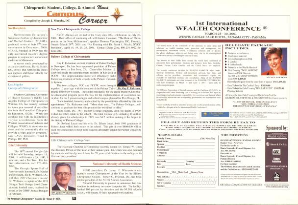 NYCC's Dr. Jack Barnathan Speaks at the Kennedy Space Center Dr. Jack Barnathan. a 1984 graduate of New York Chiropractic College, conducted a June 8lh seminar for the stuff of NASA's Kennedy Space Cen­ter at Cape Canaveral. FL. Dr. Bar­nathan—doing what he does best— informed and motivated a rapt audi­ence of scientists. He commended the Space Center for their dramatic tech­nological developments and proceeded to cite examples of far reaching influ­ences attributable to their break­throughs. In fact. Dr. Barnathan's own work in Professional and Olympic sports has been greatly assisted by NASA's discoveries. Known as "The Strength Doctor". Jack Barnathan. D.C.. distinguished himself as both Doctor of Chiropractic and Master Trainer for many of the world's top athletes and performing artists. His performance seminars are many times hosted by such well-recog­nized names as Arnold Schwarzeneg­ger's VIP Training Seminar. The Royal Caribbean "Muscle. Mind & More" fitness cruise, and the private Palm Beach Club. Mar-a-Lago. owned by Donald Trump. At his Center for Strength & Performance. Dr. Bar­nathan plumbs the depths of human development and endurance through advanced training technique and tech­nology. Attendees at the seminar included Dr. Irene Duhart Long. NASA's Chief Medical Officer. Following his address. Dr. Barnathan discussed chi­ropractic's work in the fitness arena with Dr. Long, including Dr. Kimberly Ryder's NASA funded research at New York Chiropractic College. Dr. Barnathan's presentation was taped by NASA Television and will air on its cable outlet. Officials at the Center invited Dr. Bamalhan to return and address its staff again this fall. www.nvcc.edu David Koch, D.C., Joins Palmer College of Chiropractic David B. Koch. D.C.. the former president of Sherman College of Straight Chiropractic, joined the Palmer College of Chiropractic admin­istration and faculty as of July I. 2001. He will be assisting Palmer College and Palmer West President Guy F. Riekeman. D.C.. and teaching in the philosophy and post-graduate areas. Dr. Koch has been involved in chiro­practic nearly his entire life. A long­time chiropractic patient, lie became a chiropractic student at Sherman Col­lege of Straight Chiropractic in lc)77. a chiropractor and chiropractic professor in 1981. and president of Sherman College in 1997. As a professor, he has lectured on spinal anatomy, spinal biomechanics/dynamics. X-ray/radi-ographic physics and radiographic anatomy. He has also lectured and written extensively on the philosophy ol chiropractic, and has been published in the Journal of Straight Chiropractic, the Journal of Chiro- praclic Humanities and the Journal of Vertebral Sublu.xalion Research. He resigned as president of Sherman Col­lege in October 2000. and is currently writing an exploration of chiropractic's traditional metaphysical philosophical model. "He is known tor his ability to artistically com­municate the phi­losophy of chiro­practic, as both a profound thinker and a politician who can sit at the table with representatives of the many factions of the chiropractic profession, and respect their viewpoints, while still being respected for his own views." said Palmer President Guy Riekeman. D.C. www.palmer.edu Probation for Life The CCE Commission on Accredita­tion (COA) has reviewed the applica­tion for reaffirmation of accreditation of the Doctor of Chiropractic degree program at Life University College of Chiropractic (LUCC) of Marietta. GA. The COA has deferred a decision regarding reaffirmation of accredita­tion and has imposed a sanction of Probation for the failure of LUCC to comply with established accreditation criteria. The COA has also determined that immediate public disclosure of this action is warranted. The COA has provided LUCC with information regarding specific deficiencies that must be corrected to maintain CCE accreditation. A sanction of Probation is imposed to indicate serious deficiencies toward compliance with the requirements of the CCE Shimlunls for Doctor of Chi­ropractic Programs and Institutions (Standards). The CCE Standards stip­ulate that the COA may revoke accred­ited status if the program or institution fails to correct noted deficiencies or otherwise fails to comply with require­ments stated in the Standards. Given the confidential nature of the accreditation relationship and the COA commitment to work positively in being of assistance to programs/institu- Continucd on Page 44 ...from Page 41 tions in such situations, no further or more specific information about this matter will be provided in the current circumstances. The CCE Standards for Doctor of Chiropractic Programs and Institutions may he read and copied at the CCE website: www.cce-i<sa.ort> Increase in Admission Standards | Should Result in I Well-Rounded Students ' Effective fall quarter 2001, Sherman College will raise its admissions stan­dards in accordance with the Council on Chiropractic Education (CCE), requiring students to complete 90 hours (rather than 60) of prerequisite credit prior to admission. The CCE's change in admission requirements reflects a growing trend in chiropractic education: chiropractic colleges requiring more undergraduate courses of their applicants. "The increase in prerequisite requirements gives our prospective students the opportunity to take more undergradu­ate courses and receive a more well rounded education," says Laura Chad-wick Weeks, D.C., vice president for academic affairs. "Students coming to Sherman College will have more undergraduate college experience and will have had more time to sharpen and hone the time management and study skills that are necessary for a rig­orous academic curriculum such as ours," she says. Approximately 42 per­cent of current Sherman College stu­dents hold bachelor's degrees, and an additional 24 percent enter the college with at least 90 credit hours. Director of Enrollment Services Frank Griffis s