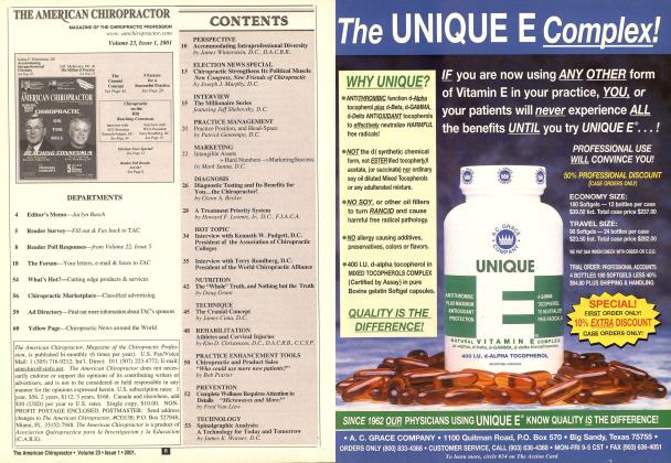 It* MAGAZINE OF THE CHIROPRACTIC PROFESSION www. chirofusion. com Volume 24, Issue 4, 2002 Validate Injuries Objective Data that Justifies Continuing Care and Highlights Benefits See Page 25 Seminar Tour features: Breakthrough Coaching Seminars See Page 38 Learn to Use the Force in Your Practice with Dr. Amelia Case See Page 10 About the Cover: black and white photo by (c) Stuart Roger Photography 2002, color photo by (c) Rod Echols 2002 DEPARTMENTS 4 Editor's Memo—by Jaclyn Busch Touzard 5 The Forum—Your letters, e-mail & faxes to TAC 24 What's Hot?—Cutting edge products & services 47 National Association News Update—Find out the latest in legislation for DCs 48 Chiropractic Marketplace—Classified advertising 50 Ad Directory Find out more information about TACs sponsors 52 Yellow Page Chiropractic News Around the World CONTENT 10 X-RAY TECHNOLOGY Q & A: Buying a High FrequencyX-Ray System— What Questions Should I Ask? By Teny Yoclmm D.C.; D.A.C.B.R.; FellowA.C.C.R. MILLIONAIRE SERIES Successful "Old Fashioned Chiropractic" Practice Focuses on Low Tech, Natural Solutions to Health Problems with Dr. Amelia Case PEDIATRICS 14 How IVlany Times Do Children Need to be Adjusted Bv Stuart P. Warner, D.C. SUPPLEMENTATION 16 Alternative Approaches to Musculoskeletal Conditions By Stuart Win. Russell, D.C. NUTRITION 18 The Nutritional Connection to "Leaky Gut" By Lynn Toohey, Ph. D. 42 The Nutritional Adjustment By David Seaman. D.C. M.S., D.A.B.C.N., F.A.C.C. PERSPECTIVE 22 Living Consciously: Your Wake-Up Call By Patrick Gen tempo, D.C. TECHNOLOGY 25 Validating Injury and Impairment with Surface EMG and Thermography Methods By David Marcarian, M.A. TECHNIQUE 3 2 About Chiropractic and Effectiveness By Jesse Jutkowitz, D. C. ORTHOTICS 3 5 Excessive Pronation and Postural Support By John Danchik, D.C, C.C.S.P.. F.l.C.C. SEMINAR TOUR 38 Featuring Breakthrough Coaching Seminars BvTAC. HOMEOPATHY 41 Sports Enhancement & Homeopathy By Frank King, Jr., D.C. REHABILITATION 46 Rehab Without Pain By Kim D. Christensen, D.C, C.C.S.P., D.A.C.R.B,