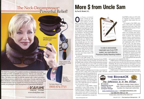 The idea of a computer in a chiropractic office was unheard of 30 years ago. In today's world, the right computer software is essential to the growth and maintenance of your practice. The right software simultaneously reduces paperwork and increases efficiency. It is important to recognize that, in order to enhance your practice, it is necessary for the right programs to be doing all the right things. This means you will have minimal filing, automated insurance billing, missed appointments that will not slip through any cracks so they never get lost or forgotten, and requests from attorneys and insurance companies are answered in minutes. With a computer, all these chores get done fast. The computer frees you and your staff to concentrate on patient care, activation, collections, recalls and marketing. Software companies are numerous. For the most efficient system, use software that integrates all the programs, so notes and billing always match, and all the data is stored forever, so you never need to print and file it. For reliability, find a company that has been around for many years that consistently updates its programs, keeping up with technology. For a product made with you in mind and to support your profession, choose a company owned by a chiropractor. Dr. Paul Bindell is a 1975 Palmer graduate, in practice in Rockaway, NJ, since 1976. In 1991, he began Life Systems so that the profession would have reliable computer programs based on chiropractic practice. Dr. Bindell can be reached by email at drpmil(uxhiropaiJxom. |] Computers & '" Software In order to enhance your practice, it is necessary for the right programs to be doing all the right things: - Minimal filing, » Automated insurance Eliminate missed appointments, Answer requests from attorneys and insurance companies in minutes. You can also find in this section: Continuing Education (See also Colleges, Seminars and Techniques) Special Note Whenever you see this sign k next to a listing be sure to look closely for the diplayed ad in this ^CX issue © ^ Paul B. Bindell