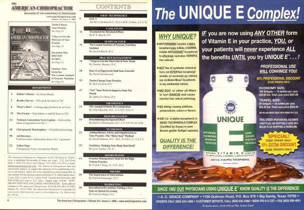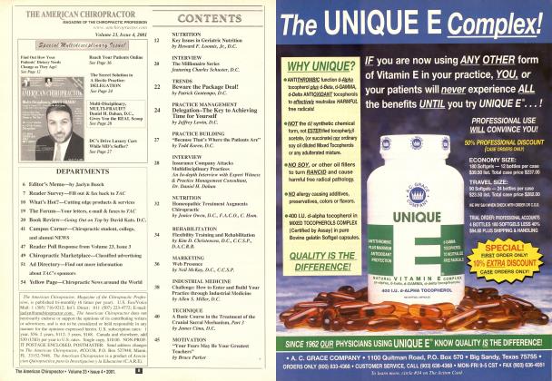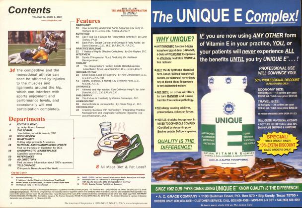 CONTENTS Volume 28, Issue 2, 2006 ■ www.amchiropractor.com FEATURES CHIROPRACTIC OVERSEAS 38 Adventures In Practice by William II.Koch, DC. PRACTICE MANAGEMENT FOCUS 17 Be Aware of Your Gifts by Mark Sauna. D. C. 20 Show me the Money bv Eric Kaplan, D. C. 24 Keep Your Head Down and Your Chin Up by Timothy J. Gay, D.C. 26 The Greatest Practice Building Secrets by David Singer, DC. 28 Automated Documentation: Helping Chiropractors Heal Their Practices hv Thomas Hyde, DC. 34 A Big Injury Practice Today by Jeffrey A. Cronk, D.C. INNOVATIONS 12 Koren Specific Technique (KST) Interview with Tedd Koren, D.C. TECHNIQUE 46 Anatomy Trains®—a Soft-Tissue Approach to Complement Chiropractic Care by Thomas Myers, D.C. ON THE COVER SPECIAL Practice Management Section 24 Achieve More for Your Practice & Yourself 26 The Greatest Practice-Building Secret 20 Billing Procedures: How to Get Started & Stay On Track 38 Adventures in Practice Experience Chiropractic Life a Different Way! 12 Dramatic Immediate Results With a new vitalistic adjusting technique INTERVIEWS 50 Ask the President Featuring Peter Martin, D.C., President of Palmer College of Chiropractic Florida and Palmer College of Chiropractic West PEDIATRIC 16 In Support of National Advertising by Jeanne Ohm, D.C., Fl.C.P.A. RESEARCH 16 Treatment of Intervertebral Disc Herniation with Manipulation by Dan Murphy, D. C. NUTRITION 52 Five Enzyme Formulas to Strengthen Your Immune System by Ellen Cutler, D.C. 54 Un-complicating Nutrition—Part 1: Diet by David Seaman, D.C, M.S., D.A.B.C.N., F.A.C.C. REHABILITATION 56 Exercise for Spinal Osteoporosis by John K. llylaml, D.C. M.P.I I., D.A.C.B.R., D.A.B.C.O., C.S.C.S., C.H.E.S. ORTHOTICS 58 Patellar Tendinitis in a Runner by John Danchik, D.C, C.C.S.P., F.I.C.C. INTEGRATIVE HEALTHCARE 60 Results Rule in Practice Management by Frank King Jr., N.D..D.C. DEPARTMENTS 4 Editor's Memo—by Jaclyn Busch Touzard 8 Books: 8 Children of Promise by Rand Olson, D.C. Reviewed by Dennis Perman, D.C. 10 One Minute Wellness by Ben Lerner, D.C. 8 What's Hot Cutting Edge Products & Services 62 Chiropractic Marketplace Classified Advertising 62 References—For more information 64 Ad Directory 64 Seminar Calendar What's going on where & when 66 Yellow Page Chiropractic News Around the World