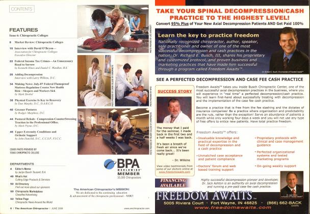 DEPARTMENTS 3 News 11 What's Hot g2 Chiro Supplies & Services Catalog 63 Ad Directory & Readers Service Center 34 Malpractice Case Summary FEATURES Issue 2: Ancillaries, Pediatric Care 14 Outcomes From Magnetic Resonance Imaging: Confirmed Symptomatic Cervical Disk Herniation Patients Treated With High-Velocity by Dan Murphy, DC 16 An Overview: Attention Deficit Hyperactivity Disorder by James Goetz, CSCS 22 Sacro Occipital Technique Research Updates by Charles L Blum, DC 28 ACA's Annual Conference to Focus on Seizing Momentum from Health Care Reform by Melissa Lee 32 Workers Compensation and Chiropractic: A Solution for Lowering Healthcare Costs by Mark Studin DC, FASBE(C), DAAPM, DAAMLP 44 How to Strategically Market in Today's Economy by Paul S. Inselman, DC 50 Why is Your Percentage of Children so Low? by Ogi Ressel.DC 54 Chronic Diseases: The Heart of the Matter by DbkVersendaal,DC,DACBN,CRA& DawnVersendaal-Hoezee, MA CRA 56 It's Vaccine Season by Tedd Koren, DC