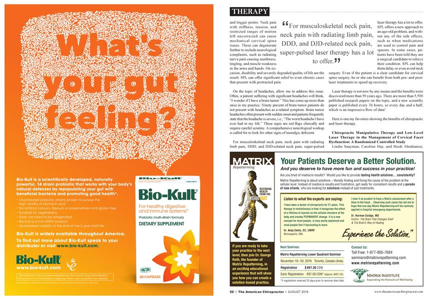 Experts in biomechanics have stated that 80% of the cervical spine’s mechanical stability comes from musculature. It would stand to reason that a mechanical condition would require a mechanical correction, and not a pharmacological one. Simply masking neck pain symptoms with drugs is a poor choice. SPL has been well established as an effective application for pain, and there is a long list of peer-reviewed papers demonstrating its effectiveness in treating myofascial pain and trigger points. The Chiropractic Council on Guidelines and Practice Parameters conducted a literature review comparing “the most commonly used treatment procedures in chiropractic for MPS and MTrPs.” A total of 112 articles were identified and reviewed for effectiveness and support in the scientific literature. Laser therapy scored the highest. “Evidence supports laser therapy (strong)...out of all the other treatments, manipulation, ischemic pressure, TENS, acupuncture, and magnet therapy.” It should be noted that while SPL is effective as a stand-alone therapy, the best results have been found when SPL is used with other modalities, such as spinal manipulation.