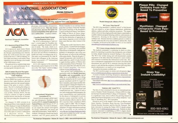 A bi-monthly report submitted by the national associations to keep you up-to-date on the latest activities affecting national laws and legislation. American Chiropractic Association (ACA) Judge Gives Green Light to Lawsuit against Trigon A federal judge has ruled thai the lawsuit of the ACA and the Virginia Chiropractic Association (VCA)— together with numerous doctors of chiropractic and their patients—against Trigon Blue Cross/Blue Shield of Virginia may move forward. In a significant decision. Judge James P. Jones of the U.S. District Court in Abingdon. V A, ruled that 6 of the 8 counts against Trigon. if proven, are sufficient to support a judgment. PTs Seek Ownership of "Manual Manipulation to Correct a Subluxation" Calling the ACA"s lawsuit against the U.S. Department of Health and Human Services (HHS) "a direct attack on the interests of its members", the American Physical Therapy Association (APTA) has requested that the court allow it to intervene in the ACA's lawsuit—a move ACA will resolutely oppose. The APTA hopes to reverse a recent legal position taken by HHS—in response to ACA's lawsuit—officially acknowledging that PT's cannot provide manual manipulation of the spine to correct a subluxation under Medicare. Your sustained support of ihe ACA's National Chiropractic Legal Action Fund will help fund both of these important lawsuits. Please make donations payable to: NCLAF. P.O. Box 75359. Baltimore. MD 21275 Another Example of ACA Lobbying Success After a sustained lobbying effort by the ACA and the Association of Chiropractic Colleges, the Senate Health. Education. Labor and Pensions (HELP) Committee has voted to approve legislation which, for the first time, would make the chiropractic profession eligible to participate in the National Health Service Corps' (NHSC) student loan reimbursement program. As approved by the HELP Committee, the chiropractic profession would be eligible to participate in the program for a three-year test period, after which Congress would consider making the chiropractic profession's inclusion in the program permanent. The House of Representatives must also pass companion legislation, and any differences between the House and Senate versions must be reconciled and approved by both houses of Congress. The ACA is grateful for the grassroots lobbying support of the Student American Chiropractic Association, and DCs across the country! International Chiropractors Association (ICA) In ICA'S New Congressional Initiatives, the Issue Is Access Two congressional initiatives have recently been introduced in the U.S. House of Representatives, at the request of the ICA. aimed at opening up new access to chiropractic services for upwards of 20 million Americans, through the Medicare and Federal Employees Health Benefits programs. These two initiatives represent responsible, practical and affordable policy enhancements that, when enacted, will make a major difference in the chiropractic economy in the United States and in the quality of health care and quality of life for millions of our citizens. MEDICARE: H.R. 2284. introduced by Representative John Lewis (D-GA). will expand the list of services reimbursed under Medicare to include examinations and X-ray services. This landmark bill will also provide that only doctors of chiropractic be authorized to deliver chiropractic services under Medicare. This important legislation represents a major step forward for the chiropractic patient, in that it removes the practical barriers that have kept millions of Medicare beneficiaries from realistic-access to chiropractic services. In order to provide the care our senior citizens need, examinations and imaging procedures, such as X-rays, are absolutely essential for the provision of quality chiropractic care. When seniors discover that Medicare only pays for the adjustment, too many make the painful decision not to seek chiropractic care, because they simply cannot afford to pay for those key elements in the chiropractic care program. This bill will open the door for those millions of citizens. ICA urges all doctors of chiropractic, students, patients and friends of the profession to ask their Member of Congress to add their names to the co-sponsors list for HR 2284. FEDERAL EMPLOYEES HEALTH BENEFITS: HR 2087. the Federal Employees Access to Chiropractic Health Care Act of 2001. was introduced at ICA's request on June 4, 2001. by Vermont Representative Bernard Sanders. This important initiative will enhance the quality of care and increase competition in federal employee health benefits programs, by insuring that beneficiaries in these programs have the right to access chiropractic care, if they feel it best meets their health care needs. This patient choice bill represents an important step forward in insuring that federal employees have the widest possible range of health care choices. This bill, also, is intended to enhance competition in federal health care programs, since chiropractic services are highly cost-effective, and represent a highly effective, drug-free, natural approach to health and healthcare that no other profession offers. The International Chiropractors Association urges all in the chiropractic profession to contact their Members of the U.S. House of Representatives and urge them to add their names to the co-sponsors list for HR 2087. Additional details of these important initiatives, along with model letters and informational materials will are available via ICA's website at www.chiropractic.org. You can find your Congressional Representatives via ICA"s website, through the Congressional Action Center in ICA's Legislative Affairs section. World Chiropractic Alliance (VVCA) This summer lias been ;i busy and productive one lor the World Chiropractic Alliance (WCA). During this period, the WCA: Continued to send all doctors who request them, tree packets of printed postcards in support of House Concurrent Resolution 46. and the chiropractic P