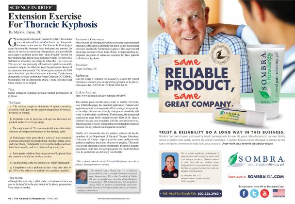 Let's talk about postural rehab as it pertains to the scoliotic patient: scoliosis results from a wide range of causes, some of which may well preclude the possibility of a successful outcome under chiropractic care. Fortunately, all cases aren't unmanageable. Many curves result from simple childhood postural imbalances which force young spines to grow abnormally. The mechanism associated with this process is simple. When young spines assume unbalanced postures, weight is transmitted unevenly onto the growing endplates. If the asymmetrical loading is significant enough, one side of the vertebral body may grow slightly faster than the other. This is known as the Heuter-Volkmann or Delpech effect in which linear endochon-dral growth is inhibited on the more compressed (concave) side of the curve. The result is gradual wedging of the vertebral body as growth on one side outpaces the other. Vertebral wedging and, consequently, much of the associated curvature becomes permanent once the growth process is completed and the endplates fuse. For this reason, successful outcomes depend upon short circuiting this vicious cycle before patients reach skeletal maturity. The goal of postural rehab is to improve spinal weight bearing and reduce the asymmetrical loading onto the growth plates. If postural correction can be achieved before the growth phase is completed, it is often possible to allow the concave side of the vertebrae to slowly "catch up" with the convexity. Postural rehab for scoliosis might include such things as reverse posture exercises, corrective traction procedures, spinal remodeling, or therapeutic stretching techniques. In order to give you a feel for how this takes place, 1 would like to share with you a real case which was managed by one of our clients. Dr. Steve Blandford, Marion, IL, recently was called to discuss a case. The patient, a thirteen-year-old female, consulted Dr. Blandford in January of 2007 regarding a pronounced thoracolumbar scoliosis which had been discovered earlier by her medical practitioner. The curve had been observed by the medical practitioner over a nine-month period, during which time it had worsened considerably. Dr. Blandford's postural examination revealed pronounced right translation and left lateral flexion of the thorax relative to the pelvis. Figure 1 shows our model simulating the patient's pre-treatment posture which has been exaggerated somewhat for purposes of illustration. The patient was examined and X-Rayed and the prc-treatment film (See Fig. 2.) shows a 28 degree Cobb angle with the apex of the curve at L-l. The patient was treated using diversified and drop table adjusting procedures and reverse posture exercises. In addition, the patient was instructed to perform spinal remodeling sessions for twenty to thirty minutes daily at home. Spinal remodeling typically consists of the patient resting passively with the spine in the reverse or "opposite" position of the abnormal posture observed during the postural examination. In this case, the patient was given a firm, pyramid shaped, foam fulcrum to place beneath L-l to facilitate stretching of tight tissues at the apex of the curve. The patient was treated in the office three times weekly for approximately three weeks and then rechecked once every four to six weeks until November of 2007, at which time a post care film was taken to determine the status of the curvature. During this time, the patient was very faithful in performing her spinal remodeling sessions and exercises at home. Figure 4 shows the post care film with the Cobb angle reduced by fifteen degrees. That's a thirteen-degree correction in a period of eleven months with a total of only sixteen office visits. Discussion: Luckily, this case presented for chiropractic care before the growth process ended. Early intervention favors successful outcomes by allowing for additional treatment prior to the end of skeletal growth. This excellent correction is a great example of the synergy created between a doctor well versed in postural care methods and a patient disciplined and determined to follow through with the all important program of home care. Congratulations to both doctor and patient for all their hard work! Dr. Mark R. Payne is the president of Mall in Mfg., a manufacturer and distributor of postural rehab products since 1988. To download a full and unabridged version of this article, link to www.MatlinMfg.com. To learn more about managing the scoliotic patient with simple postural rehah methods, call I-334-44S-1210 for our Free Report: Correcting Posture in the Coronal Plane.EZS3 Fig. 1 Pre Treatment Posture. Fig. 2 Pre Treatment - 28 Degree Cobb Angle Pre Treatment 28 Degree Cobb angle The patient was examined and X-Rayed and the pre treatment film (See Fig. 2.) shows a 28 degree Cobb angle with the apex of the curve at L-1. Fig. 3 Spinal remodeling performed over foam fulcrum. Post X-Ray 15 Degree Cobb angle Fig. 4 Post Treatment Film -15 Degree Cobb angle.