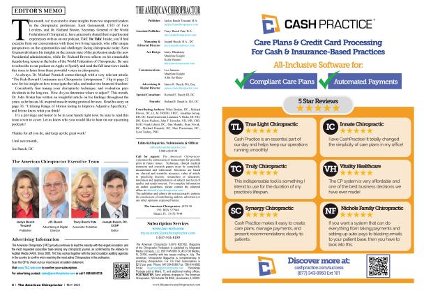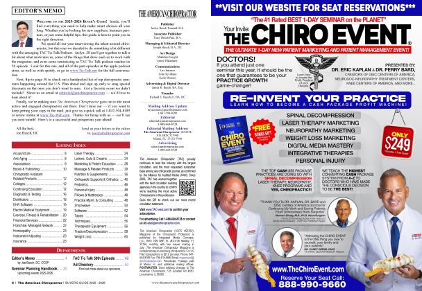 That’s not all, in the middle you will find this month’s edition of the Chiropractic Assistant. Be sure to pass it around the office for all to share in the tips inside. We value you and your team’s tireless effort to the health of your patients. Update your mailing information at www.bit.ly/tac-sub, so that you can be sure you don’t miss a single issue!